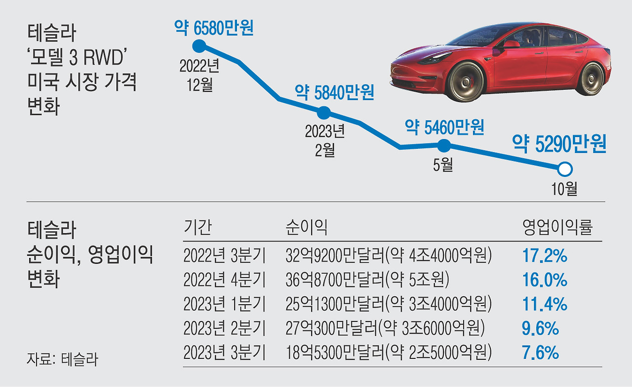 특히, 테슬라의 '모델 3 RWD' 가격이 미국 시장에서 큰 폭으로 하락했습니다. 2022년 12월에는 약 6,580,000원이었던 가격이 2023년 10월에는 5,290,000원으로 떨어졌습니다. 이러한 가격 인하는 소비자들에게는 긍정적인 신호일 수 있지만, 회사의 수익성에는 부정적인 영향을 미칠 수 있습니다.